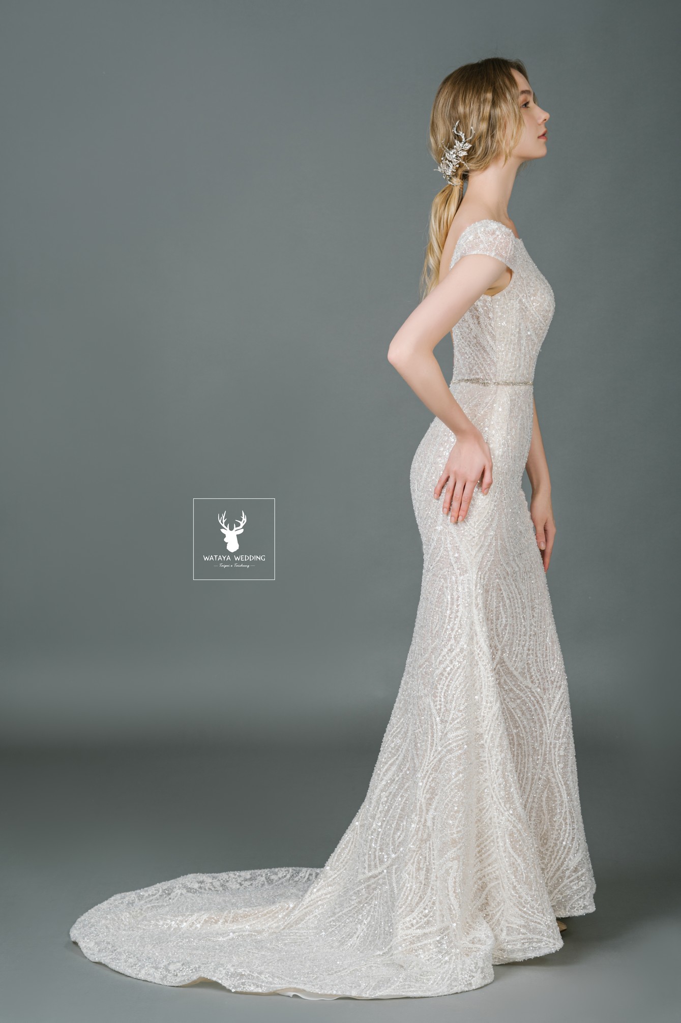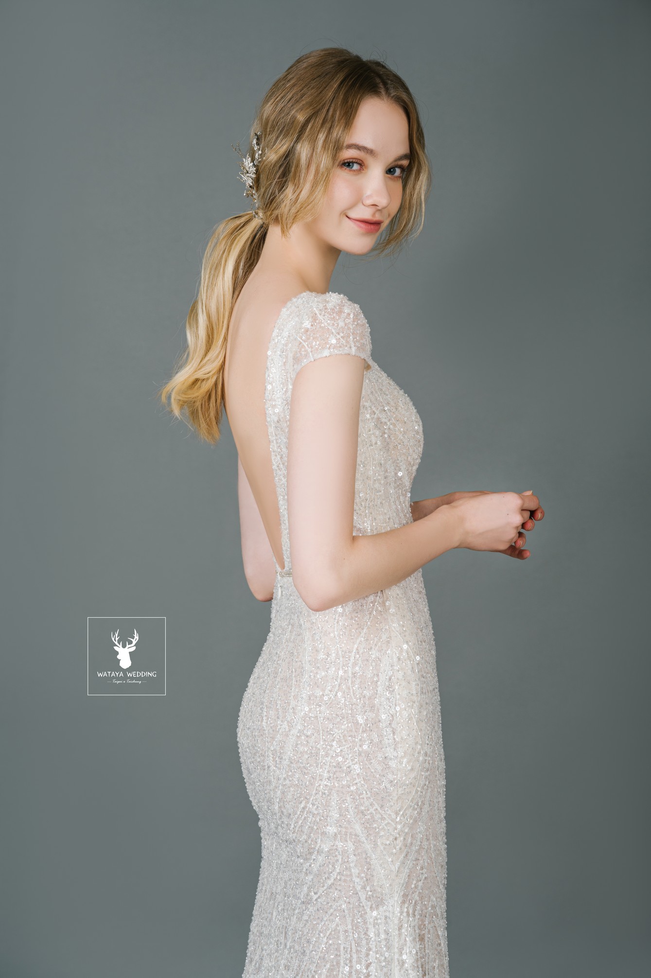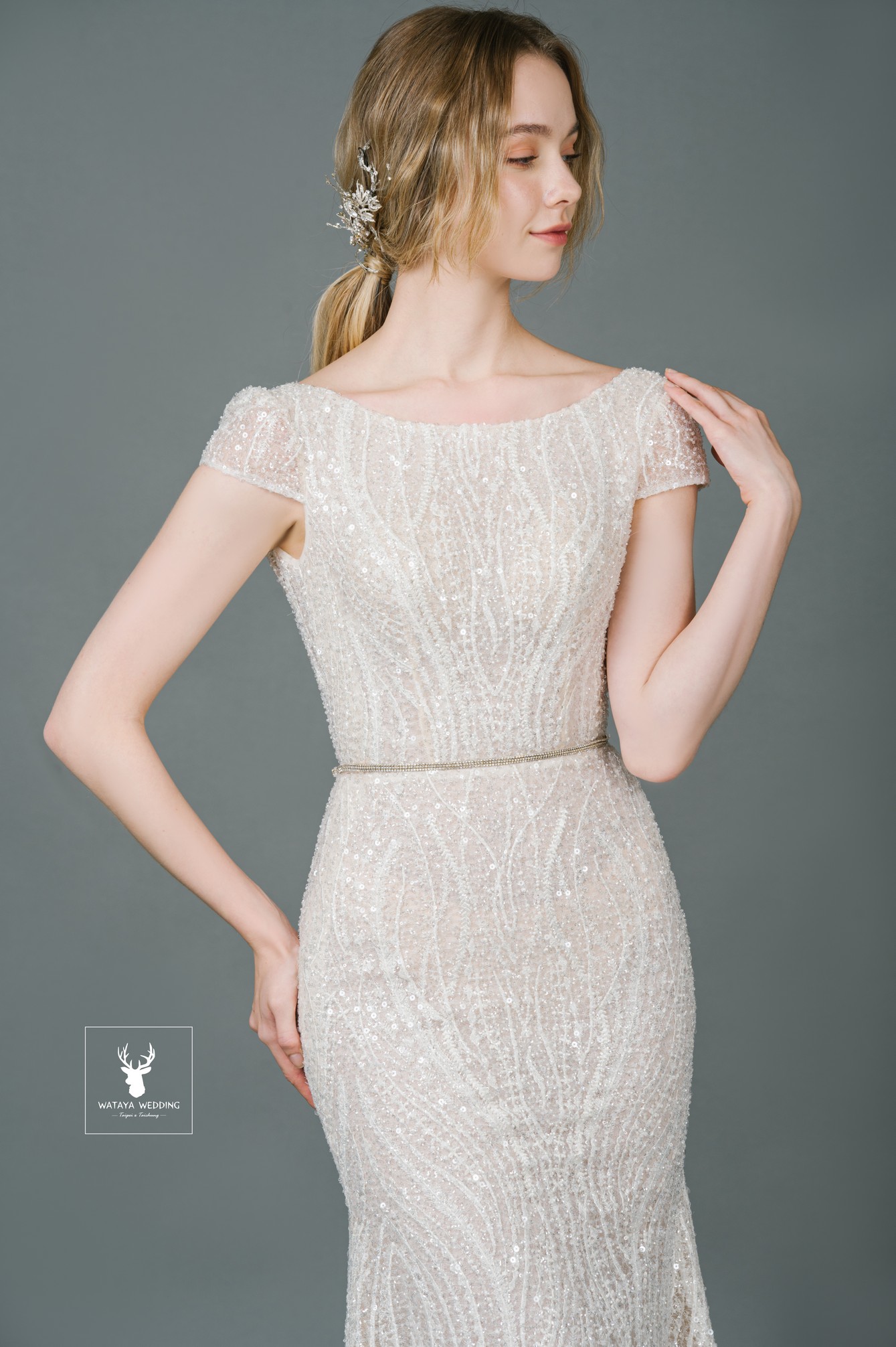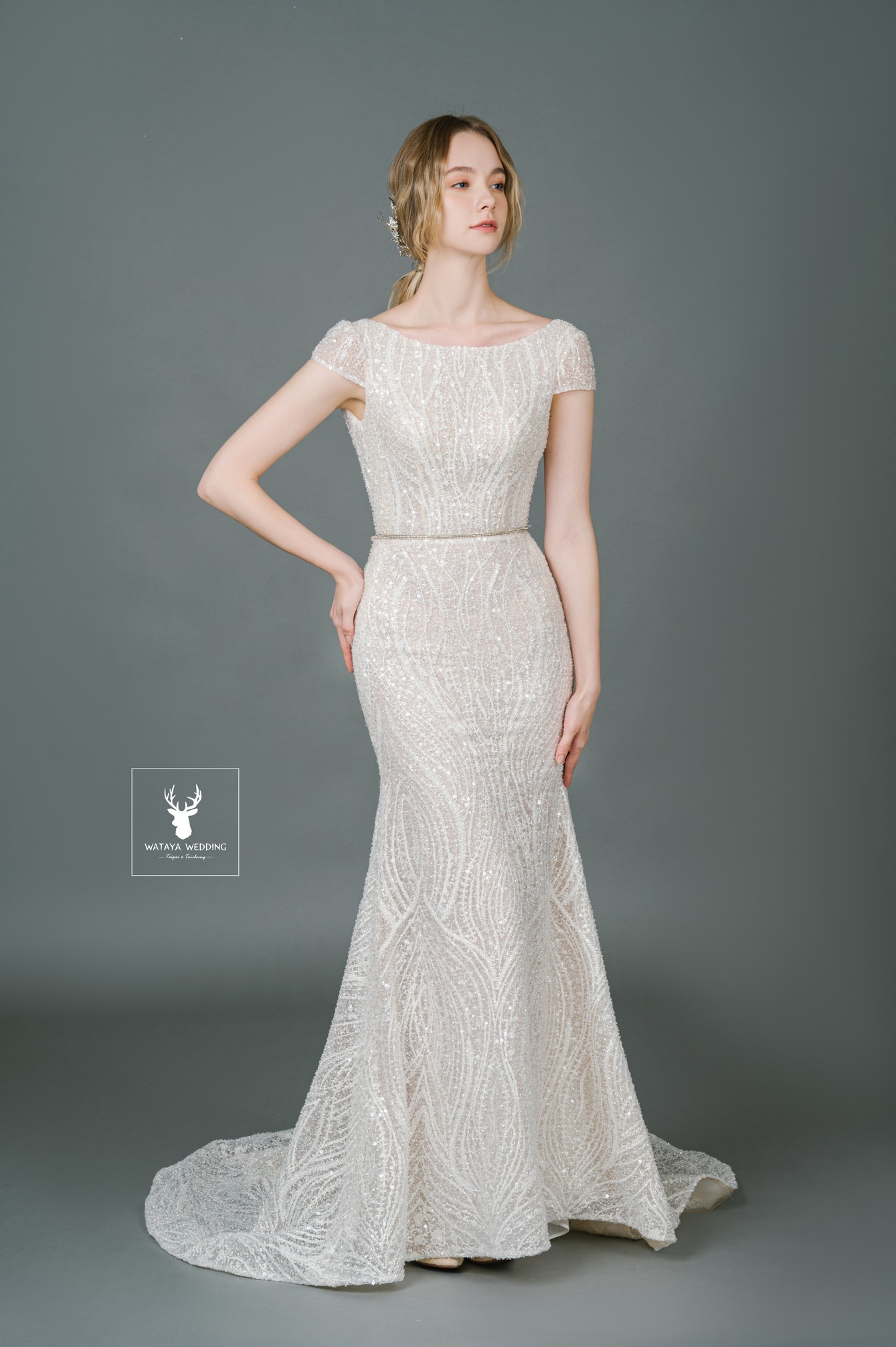 全蕾絲珠鑽刺繡細節,展現女神光芒✨優雅圓領與微魚尾剪裁,修身又大器,背後挖空設計增添小性感💫